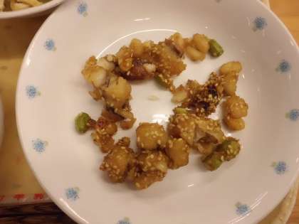 たらと4種類の豆をそれぞれ揚げて,甘辛いたれとからめました。