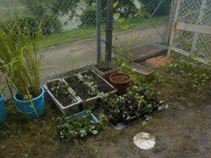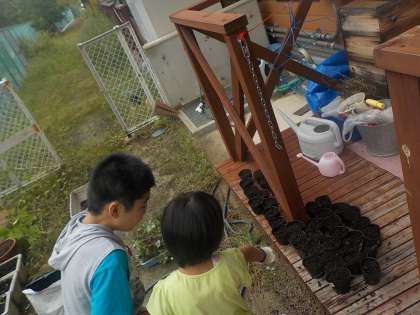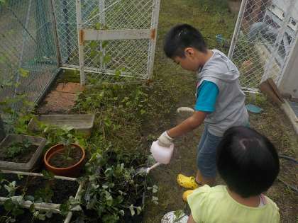 夏に収穫したイチゴが芽を伸ばして,小さな株が畑にたくさんできてました。そこで一つ一つの株をポットやプランターに移して苗を作りました。しばらく学級の前で育て,秋には畑に植えかえたいと思います。