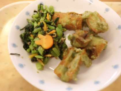 ちくわのいそべ揚げは青のりをまぶして揚げました。