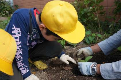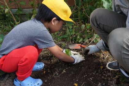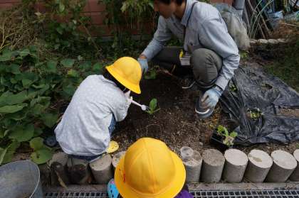 トマト,ナスが終了した畑に,新しくハクサイの苗を植えました。収穫してどんな料理をするか楽しみですね。