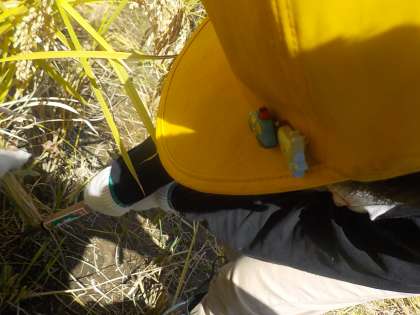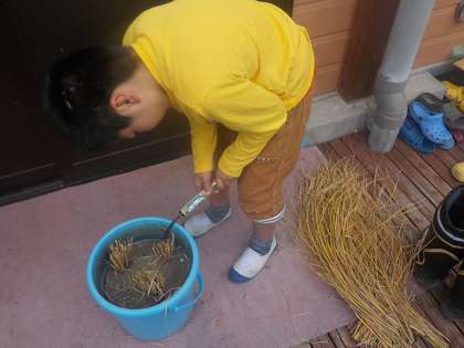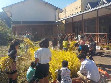 秋になり米の収穫の時期を迎えました。「お家で稲刈りをしたよ」「コンバインにのせてもらったよ」というお話もたくさんしてくれていました。学校で育てていたバケツの稲と5年生と植えた稲の刈り取りを行いました。5年生と植えた稲の刈り取りの前には,JAの方に刈り方を説明していただいた後,作業をしました。自分の手でザクザクと刈り取る感触が心地よかったようです。この後,天日で干して脱穀し精米もする予定です。どんな味のお米になっているのかとても楽しみです。