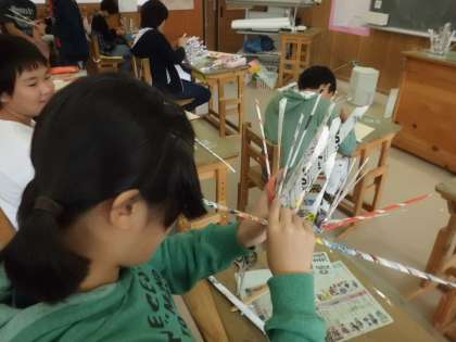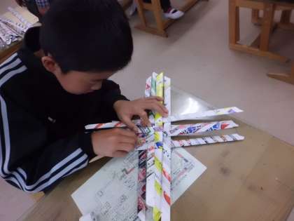広告紙を使って,織る・編む・組む...どんな入れ物ができるかな?卒業記念品として在校生にプレゼントしたいと思っています。