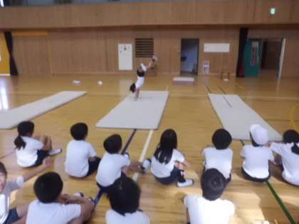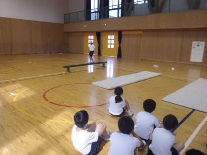 最後のマットあそびで,今までの成果を発表しました。前転・後転・側方倒立回転・跳び前転をみんなの前でしました。友達が回った後にみんなが拍手をし,とても良い雰囲気で行うことができていました。