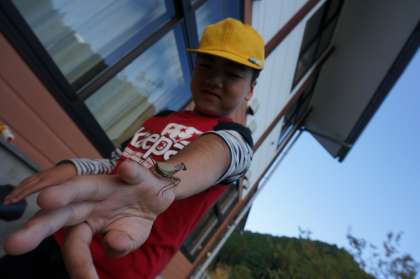 ベランダにカマキリがいました。手に乗せると,するどい足でしっかりしがみついて離れません。そのまま様子を見ていると,手から顔に向けて,「食べちゃうぞ〜」と腕をどんどん上ってきました。