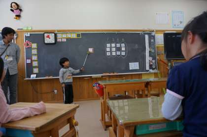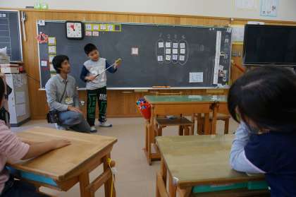 国語の学習で漢字の練習をしました。いろいろな漢字について,読み方や使い方を説明しました。「これは『目』です。塩をかけてはいけません。」というように,お手本をもとに,上手にすらすら発表することができました。
