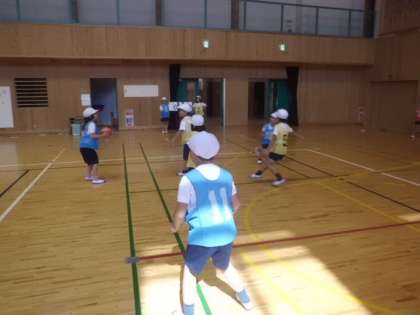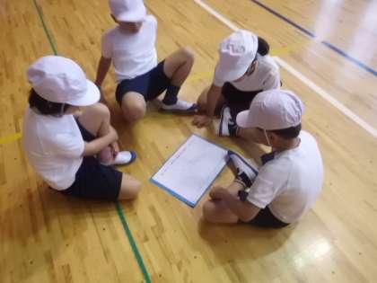 パスの受け方や,味方へのパス,ボールを持たない時の動きなど体育を行っていくごとに上達してきています。チームでの作戦タイムではみんなの考えを出し,さらに体を使って練習もしていました。