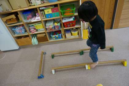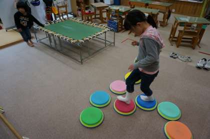 今日は雨で外で遊べなかったので,休み時間には教室にいろいろな道具を出してからだつくりの運動をして遊びました。うまく足に力を入れてミニハードルの上を歩いたり,トランポリンで勢いよく跳ねたりしました。雨の日でも元気に過ごしました。
