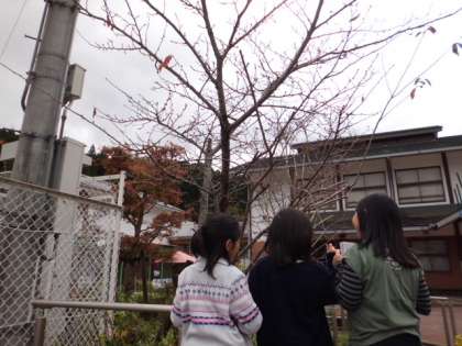 春から観察しているツバメ,サクラの様子と,他の秋の生き物探しをしました。