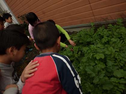 ダイコンの観察をしました。「わぁ,葉っぱが大きくなっている!」「白いところも見えてきたよ。」とダイコンの成長を喜んでいました。