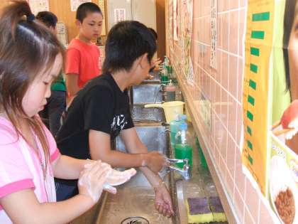 毎日笑顔健康委員会の児童が中心となって,低学年・中学年・高学年別に正しい手洗いの方法を伝えました。次に話を聞いた全員が,実際にランチルームの手洗い場を使って手を洗いました。知っているだけではなく,正しい手洗いが日常的にできるようになることを目指しています。