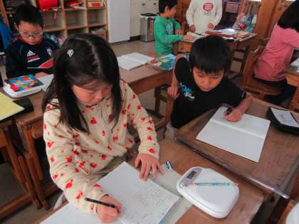 理科ではデジタルのはかりを使い,重さの学習をしています。いろいろなものをはかりの上にのせ,重さを測っていました。