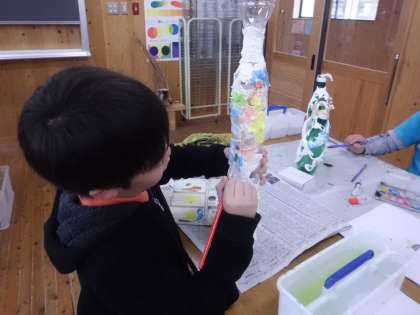 好きな形に切ったペットボトルを組み合わせ,周りに紙粘土をつけて,自分のゆめの家を作っています。色をつけると,また違った様子になります。