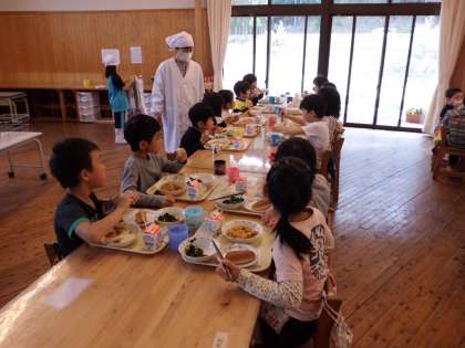 ランチルームで食べることから給食当番まで,いろいろなことが初めての1年生です。
