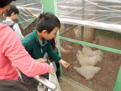 運動場にある小屋には,うこっけいとうさぎがいます。どこにいるのかな,どんなすがたをしているのかな…と覗き込んでいる子どもたちです。