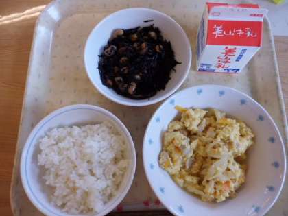 遠足から無事帰ってきて,時間どおりに楽しく給食を食べました。