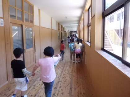 2年生に教室の場所や使い方を教えてもらいながら,学校探検をしました。「メディアルームの中に初めて入った。」「2階の教室には,こんなものがあった。」と,終わった後に発見したことの発表をしあいました。