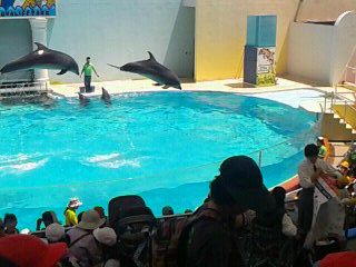須磨水族園でイルカのショーを見学しています。幼稚園から中学生まで、すごい人出です。