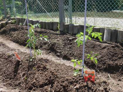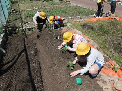 5年生では米と野菜を育てます。今回はきゅうりとトマトの苗を植えました。