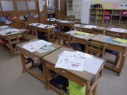 5月16日(月)避難訓練がありました。その後,教室での避難の仕方を話し合いました。机の下にかくれて,机の脚をしっかり持ち,身を守る練習をしました。真剣に避難することができていました。