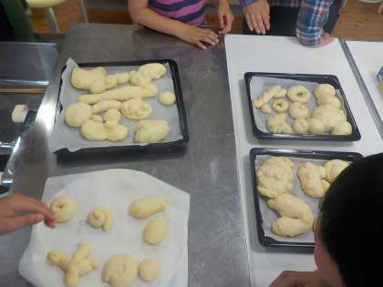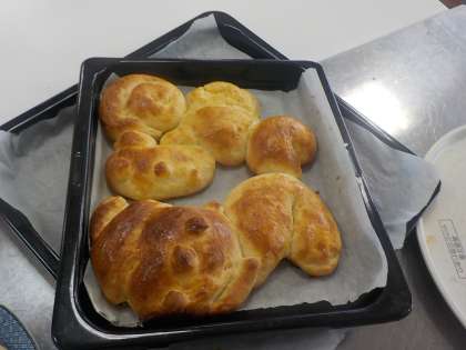 生活単元の時間にパン作りに挑戦しました。小麦粉に卵,バター,塩,砂糖,牛乳そしてイーストを混ぜて生地を作りました。作った生地が2時間後には3倍くらいに膨らんでいてみんなびっくりしていました。発酵した生地を一度しぼませ切り分けて,どんなパンにしたいか,親子で相談しながら成形しました。焼きあがったパンは,どれもおいしそうでみんな笑顔になりました。