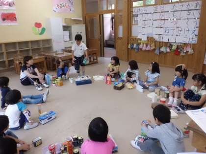いろいろな形の箱や缶を集めて,みんなで見てみました。転がってしまうもの,積みやすいものなどいろいろな違いを見つけていました。