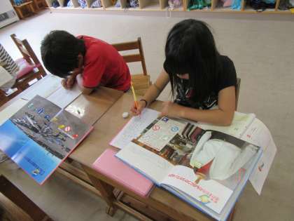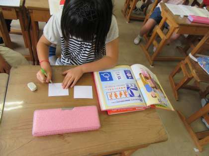 国語の学習では,自分が気になった記号を調べ説明する文章を書いています。本を使って調べたり,説明する文章を書いたりしています。