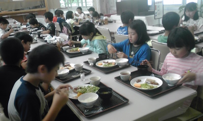 朝食は和食です。のり巻きを作る子もいました。