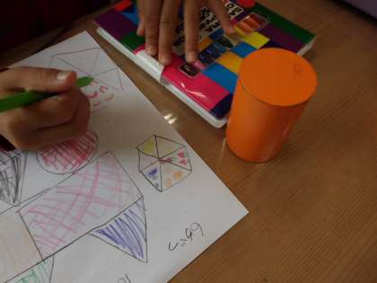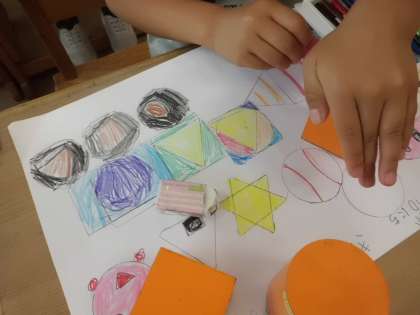 かたちをうつして,絵をかきました。「しかく」や「さんかく」,「まる」の特徴を考えながら,それぞれ絵をかいていました。