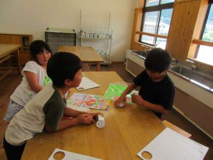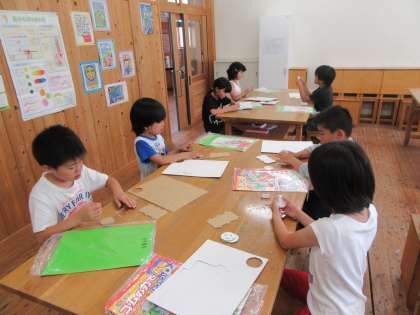 図工の学習では,ゴムの力で動くおもちゃを作っています。