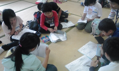 感動体験発表に向けて、グループで車座になって話し合っています。