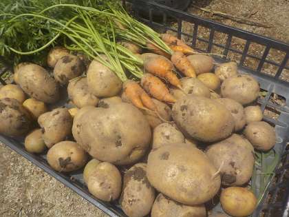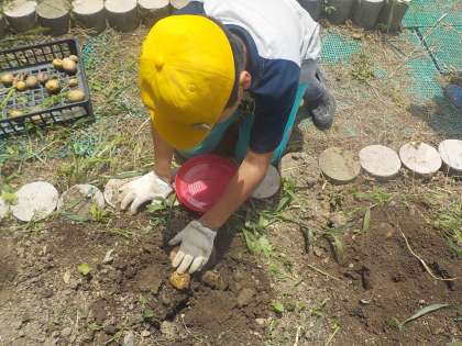 春に植え,観察や世話を続けてきた野菜たちがどんどん大きくなっています。ジャガイモとニンジンは土の中で大きく育っていました。土の中から大きなジャガイモを見つけると自然に笑顔になりました。