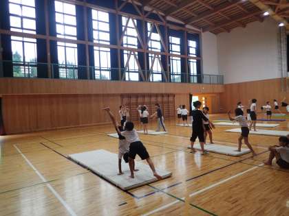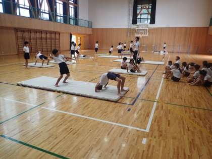 体育では,4・5・6年で組体操の練習をしています。ブリッジ,さかだち,肩車などの練習をしました。運動会でよい発表ができるようにしていきたいと思います。