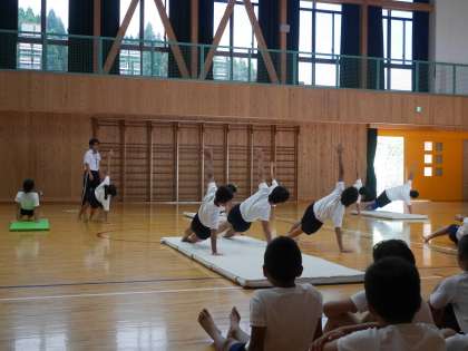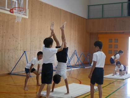 9月の運動会に向けて,組体操の一人技に取り組んでいます。