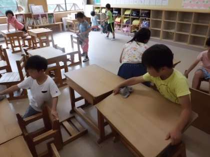 夏休み前に,教室の掃除をしました。机やいすのあしを拭いて,休みに入る準備です。