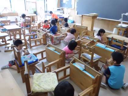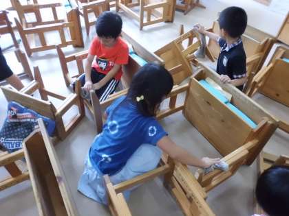 夏休みを前に教室の大そうじです。普段は拭かない机と椅子もきれいにしています。