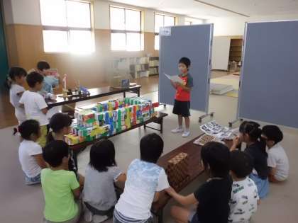 夏休みに作った作品の発表会をしました。友だちの作った作品をしっかり見ていました。