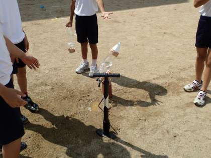 4年生は,「とじこめた空気や水」の学習の発展学習として「ペットボトルロケット」をとばしました。発射台の下に台を置いたり,ゴム栓がゆるまないようにしたりして,工夫して活動できました。ロケットがとんだ時は,歓声を上げていました。