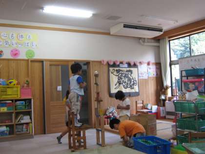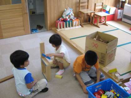 運動会に向けての練習が続き,疲れも出てきています。休み時間には,少し体を休めつつ室内遊びをしました。みんなでどれだけ高く積み木を積めるかを考えたり,それぞれのお家を作ったりして楽しみました。