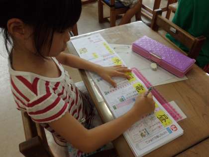 漢字の学習です。今日は新しく「半」「電」を習いました。筆順もしっかり覚えようと丁寧に書いていました。