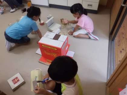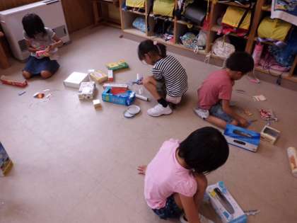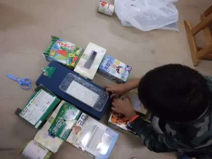 箱やペットボトルを組み合わせて,思い思いの形を作っています。どんな作品ができるでしょうか。