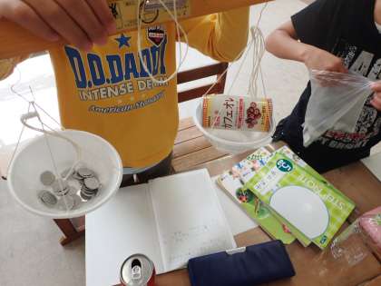 天秤を使い,「一円玉いくつ分か」をはかりました。電池などをはかり、「100こ分以上ある」と驚いていました。楽しく,生き生きと学習していました。