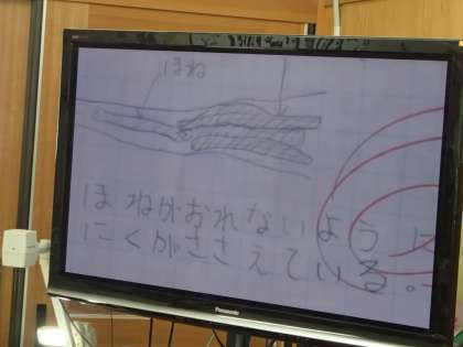 理科で「腕にどのように筋肉がついているのか?」「曲げたり伸ばしたりするとどうなるか?」を学習しました。紙で作ったモデルを元に発表しました。
