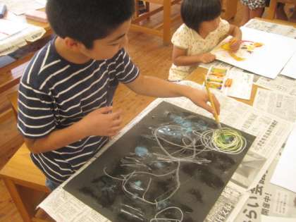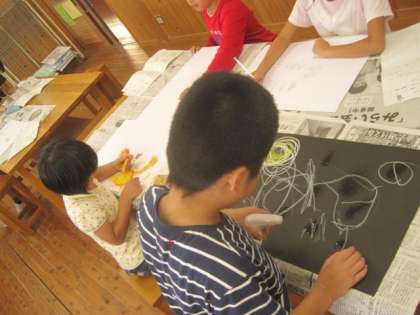 お話の絵に取り組んでいます。本のイメージから感じたことを画面いっぱいに表現しています。どんな作品になるか楽しみです。