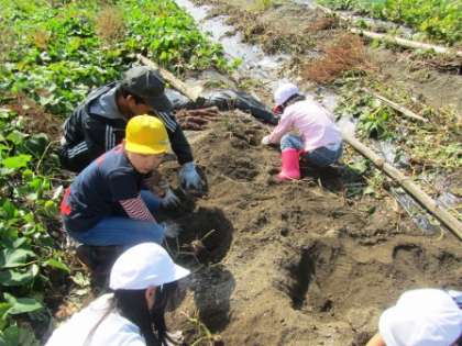 生活単元学習の時間に2年生と一緒に芋ほり体験をしました。土を深く掘ることが難しかったですが,根気強く作業をして大きな