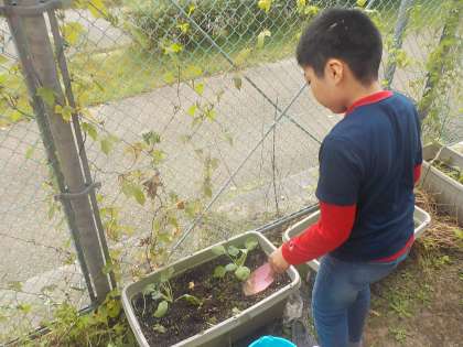 芽キャベツの苗を植えました。大きく育つように丁寧に植え,水をたっぷりあげました。