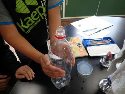 理科では,「ものの温度と体積」の学習をしています。今日はペットボトルの穴にせっけん水で膜を作り,ペットボトルを手であたためると,せっけん水の膜がどうなるかを実験しました。せっけん水がふくらむ様子に驚いていました。