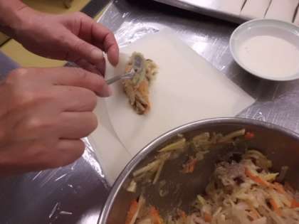 給食室でひとつひとつ心をこめて具をつつみ