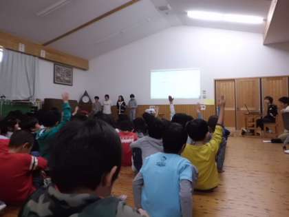 後期の委員会についての児童会総会がありました。1年生も感想や質問したいことを考えて,手を挙げて発表していました。