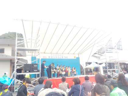 消防の図画で入賞した児童がふるさと祭りで表彰を受けました。たくさんの人の前で少し緊張していましたが,堂々と式で賞状を受け取ることができました。