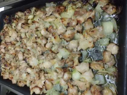 しょうゆ・料理酒・みりんで下味をつけた,鶏肉と玉ねぎを